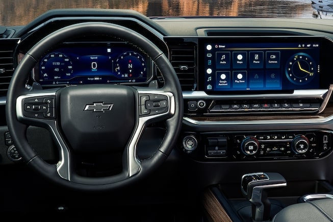 The new Chevy Silverado comes with a standard 7-inch touch screen, wired smartphone connectivity and a two-speaker stereo. You can upgrade to a 13.4-inch touch screen, wireless smartphone integration, wireless device charging, satellite radio and a seven-speaker stereo. Other available upgrades include dual-zone automatic climate control, remote start and a sunroof.